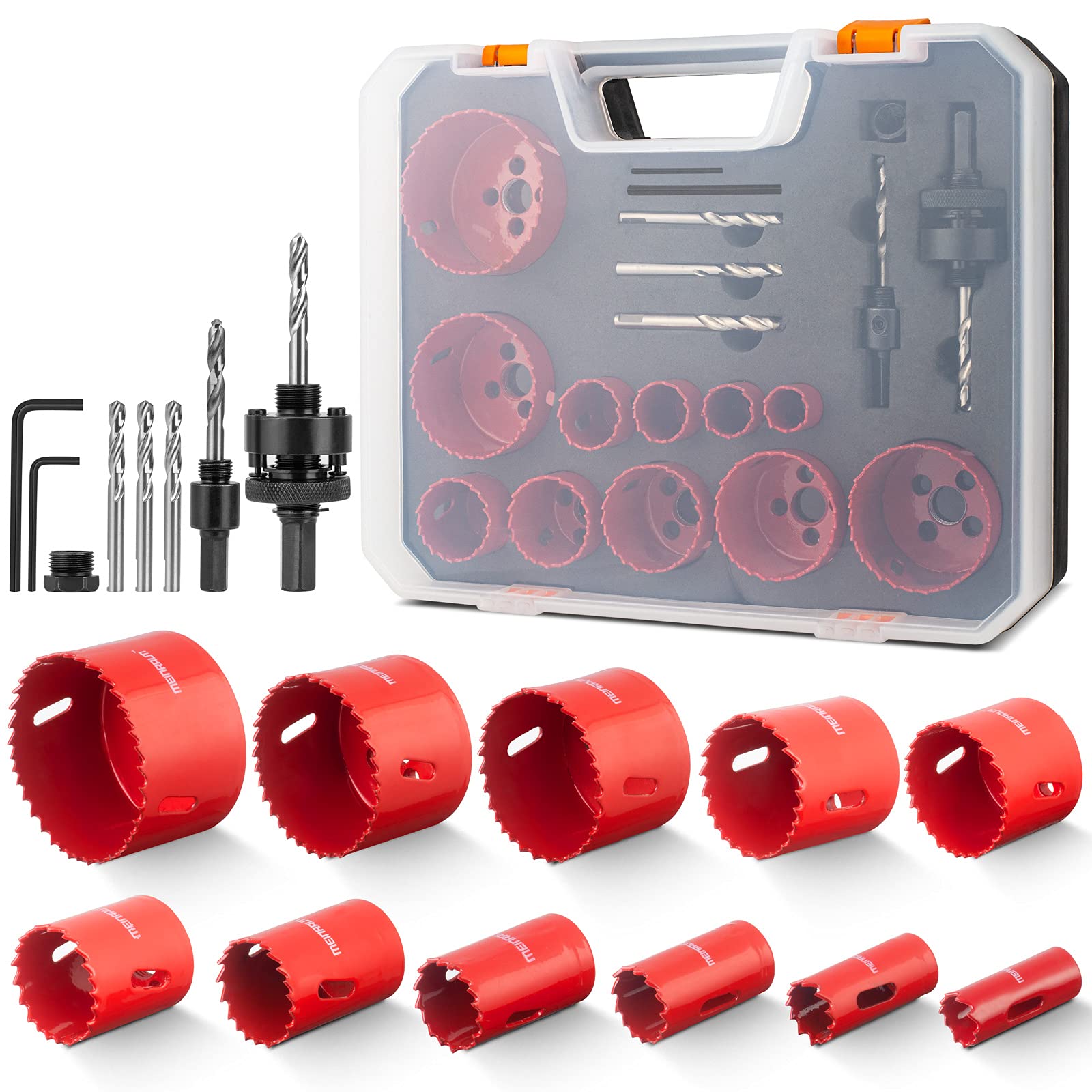 flintronic Universal Lochsäge, 19 PCS Hole Saw, Lochkreissäge mit 13 Sägeblättern 18mm-75mm, Lochfräse Schnellarbeitsstahl HSS Bimetall, Lochfräse Set für Aluminium, Holz, PVC und Kunststoffplatte Rot 13 Stück 18-75mm