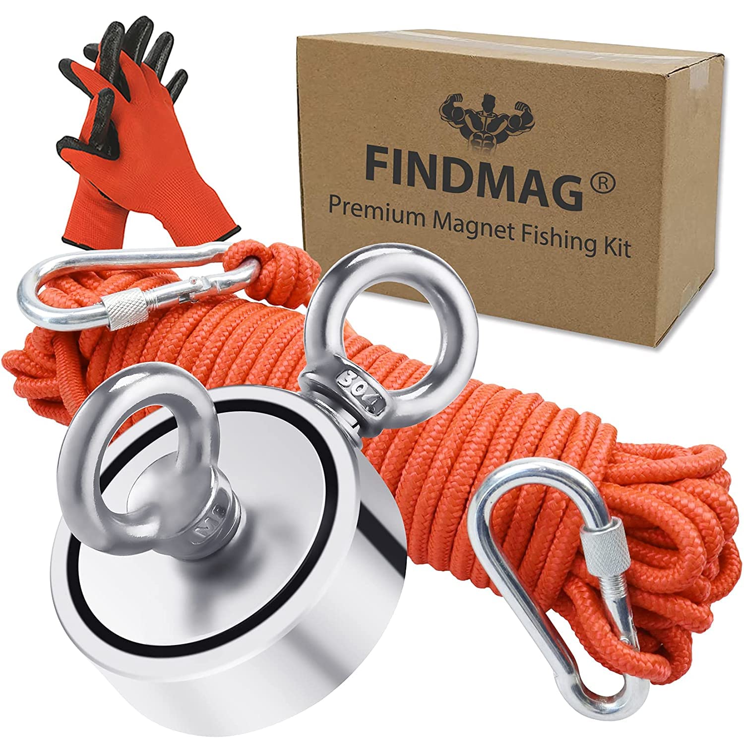 FINDMAG Super Stark Angelmagnet, 453 kg Zugkraft doppelseitiges Magnetangel Set mit Seil, Magnetfischen Set zum Herausnehmen von Gegenständen im Fluss, See, Strand, Rasen - 7,5 cm Durchmesser 75mm