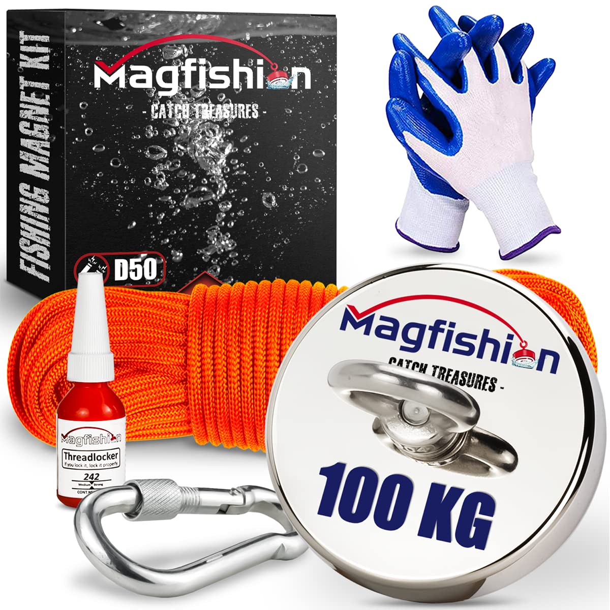 Mit dem Magfishion Magnetfischen Set erleben Sie das ultimative Angelvergnügen! Dank des leistungsstarken 100 kg Neodym Magneten mit einem Durchmesser von Ø50mm können Sie in Gewässern nach einzigartigen Funden und Schätzen suchen. Das Komplettset umfasst ein 20 Meter langes dunkeloranges Seil mit Karabiner sowie Schraubensicherungshandschuhe, die für einen sicheren Halt sorgen und das Gewindeverschluss fest an seinem Platz halten. Zudem sind die Magnete von Magfishion in höchster Qualität hergestellt und wurden auf Zugfestigkeit getestet, um Ihnen die beste Erfahrung bieten zu können. Fühlen Sie sich wie ein professioneller Angler und genießen Sie das Magnetfischen mit dem Magfishion Set.