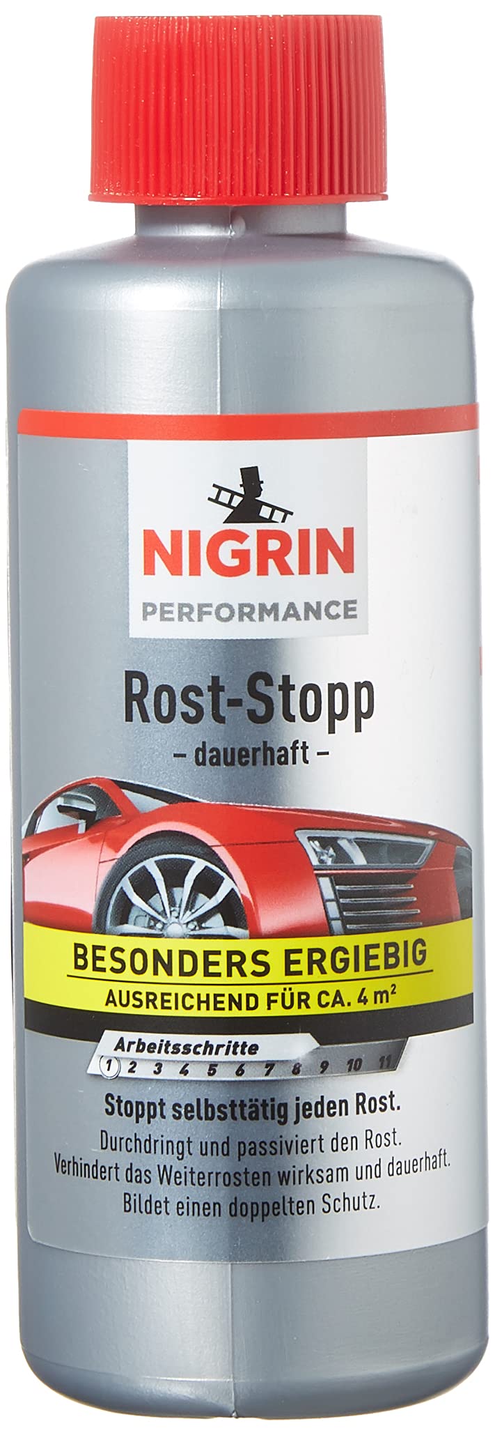 Beschützen Sie Ihr Fahrzeug oder andere metallische Oberflächen mit dem hochwirksamen NIGRIN Rost-Stopp - dem ultimativen Korrosionsschutz auf Tanin-Basis. Geeignet für die Reparatur und Instandsetzung von verrosteten Bereichen, ist dieses Produkt die perfekte Lösung, um Ihren Arbeitsaufwand zu reduzieren und die Lebensdauer Ihrer Maschinen, Werkzeuge oder Autoteile zu verlängern. Mit dem NIGRIN Rost-Stopp als Haftgrund, können Sie den weiteren Spachtel- und Lackaufbau beschleunigen und sicherstellen, dass jede Fläche optimal geschützt wird. Es stoppt selbsttätig jeden Rost und verhindert das Weiterrosten effektiv und dauerhaft. Ein besonders ergiebiges Produkt, das für eine Fläche von ca. 4 m² ausreichend ist. Mit dem NIGRIN Rost-Stopp erhalten Sie einen Korrosionsschutz-Lack auf Tannin-Basis mit roststoppenden Eigenschaften und sind auf der sicheren Seite für jede Herausforderung. Der Lieferumfang umfasst 1 x 200 ml NIGRIN Rost-Stopp, um sicherzustellen, dass Sie jedes Projekt perfekt abschließen können. Investieren Sie in Ihre Materialien und profitieren Sie von einem herausragenden, langanhaltenden Korrosionsschutz mit NIGRIN Rost-Stopp!