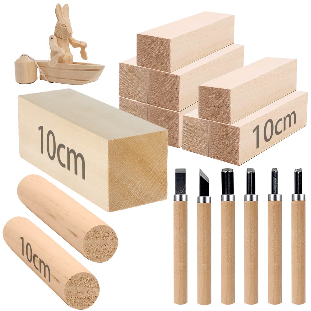 COPSD 11-Teiliges Lindenholz Zum Schnitzen Rohlinge Holz Wood Und 6-Teiliges Schnitzmesserset, Basswood Carving Schnitzholz FüR Kinder Holz Zum Schnitzen FüR AnfäNger, Kinder, Erwachsene, Diy Type 1-10cm