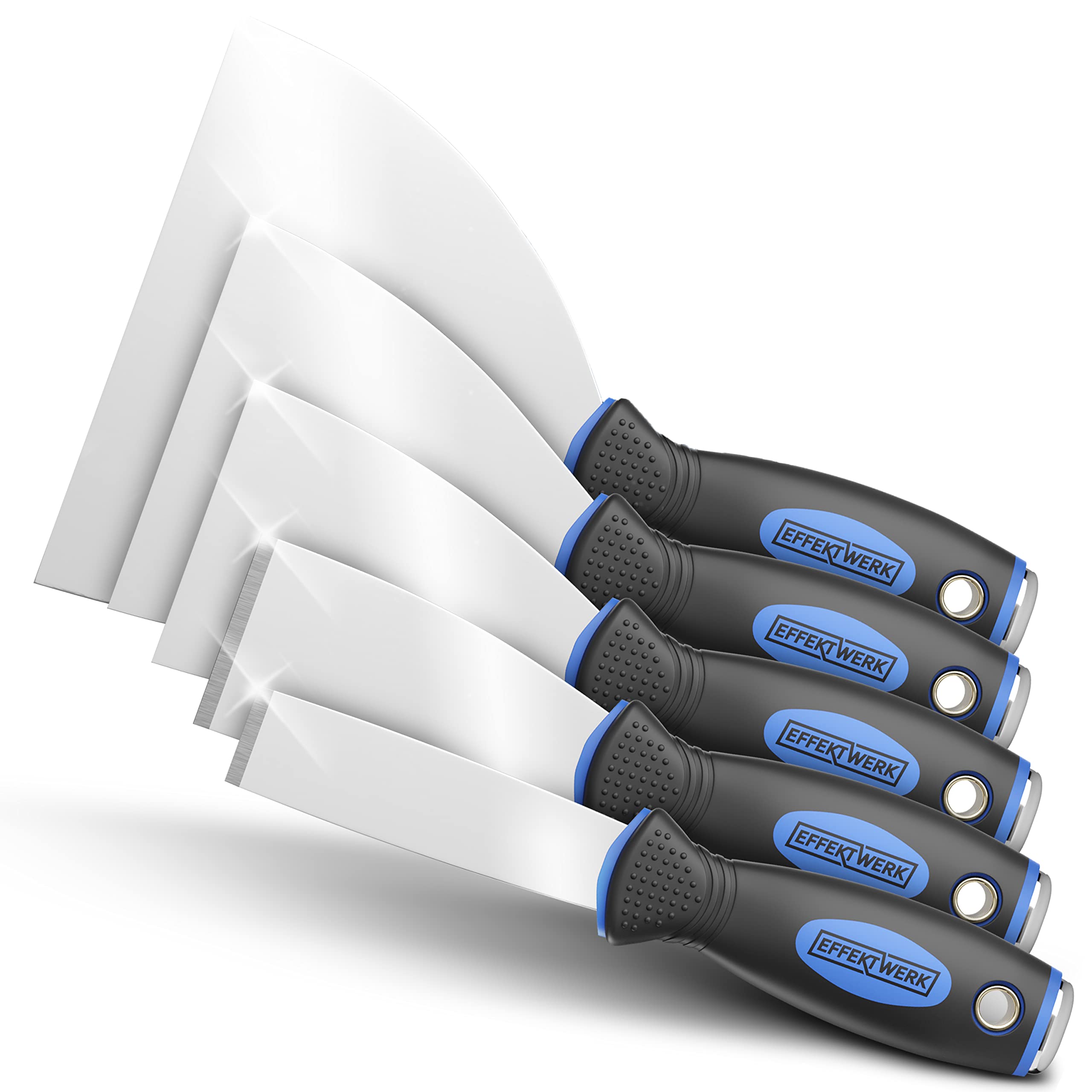 EFFEKTWERK Profi Spachtel Set - 5tlg Spachtel aus rostfreiem Edelstahl - 2x stabil zum Tapeten entfernen mit Anschliff & Metallplatte - 3x flexible Malerspachtel - Maler Werkzeug Spachtelset