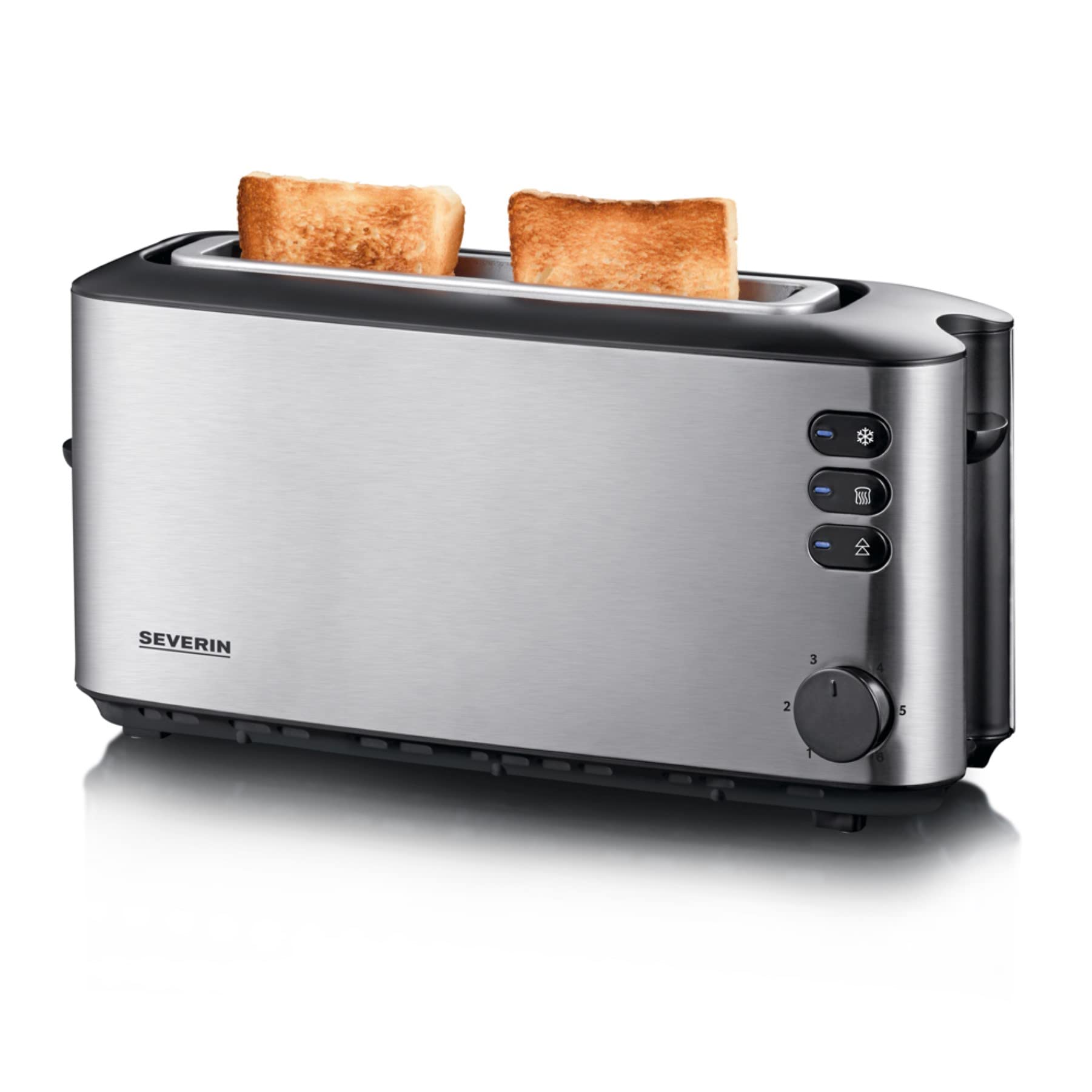 SEVERIN Automatik-Langschlitztoaster, Automatik-Toaster mit Brötchenaufsatz, Edelstahl Toaster zum Toasten, Auftauen und Erwärmen, 1.000 W, Edelstahl-gebürstet, schwarz, AT 2515-1 Langschlitz-Röstkammern