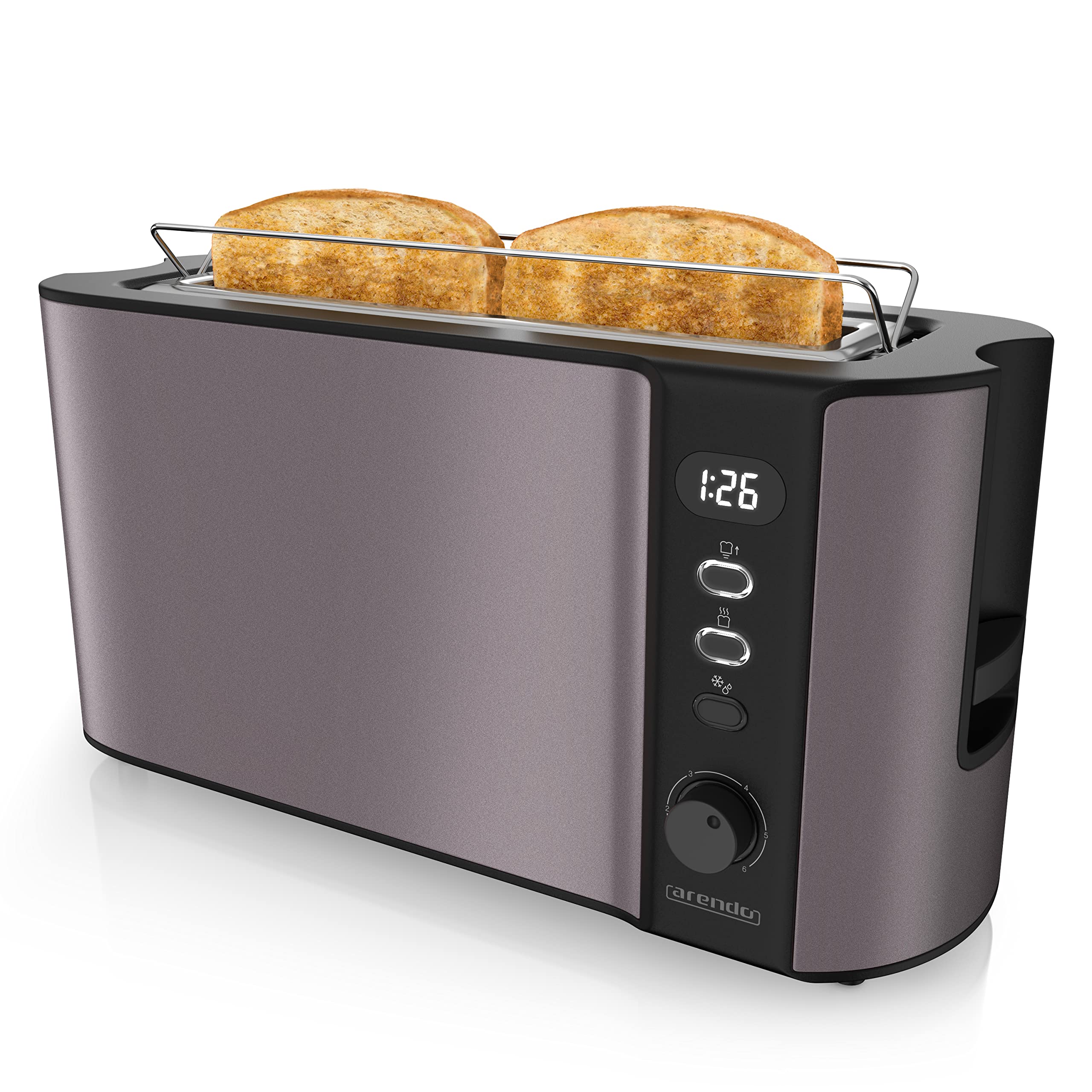 Arendo - Toaster Langschlitz 2 Scheiben - Defrost Funktion - 1000W - Doppelwandgehäuse - Integrierter Brötchenaufsatz - Bräunungsgrade 1-6 - Display mit Restzeitanzeige D: Silvergrey
