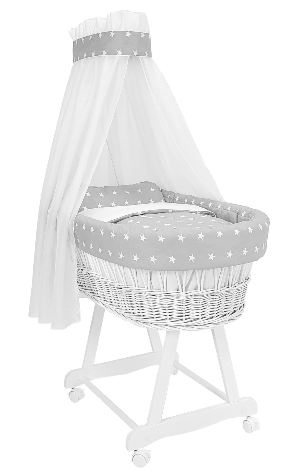 Für Eltern, die auf der Suche nach einem hochwertigen und stilvollen Stubenwagen sind, ist der Amigos Stubenwagen in Weiß mit grauen Sternen ein echtes Highlight. Mit einer Liegefläche von ca. 68 x 36 cm bietet der Stubenwagen ausreichend Platz für Ihr Neugeborenes. Der Amigos Stubenwagen bietet nicht nur eine moderne Optik mit grauen Sternen auf weißem Hintergrund, sondern auch eine komplette Ausstattung. Die 9-teilige Ausstattung des Babybetts umfasst auch eine gepolsterte Matratze, um Ihrem Baby einen erholsamen Schlaf zu ermöglichen. Alle Materialien sind frei von Schadstoffen und daher ideal für Allergiker geeignet. Die atmungsaktiven Stoffe sind perfekt auf die Bedürfnisse von Babys abgestimmt. Der Stubenwagen ist mit 4 bremsbaren Schwenkrollen ausgestattet und lässt sich somit leicht von einem Zimmer zum anderen bewegen. Das massive Untergestell aus Buche ist weiß lackiert und bietet eine stabile Basis für den handgefertigten Weidenkorb, der ebenfalls weiß lackiert wurde. Dieser ist das Herzstück des Stubenwagens und besticht durch seine liebevolle Handarbeit und einzigartige Optik. Der Amigos Stubenwagen in Weiß mit grauen Sternen ist ein echtes Schmuckstück und überzeugt nicht nur durch seine moderne Optik, sondern auch durch seine hochwertigen Materialien und eine umfassende Ausstattung, die Ihrem Baby einen sichereren und komfortableren Schlaf ermöglicht.