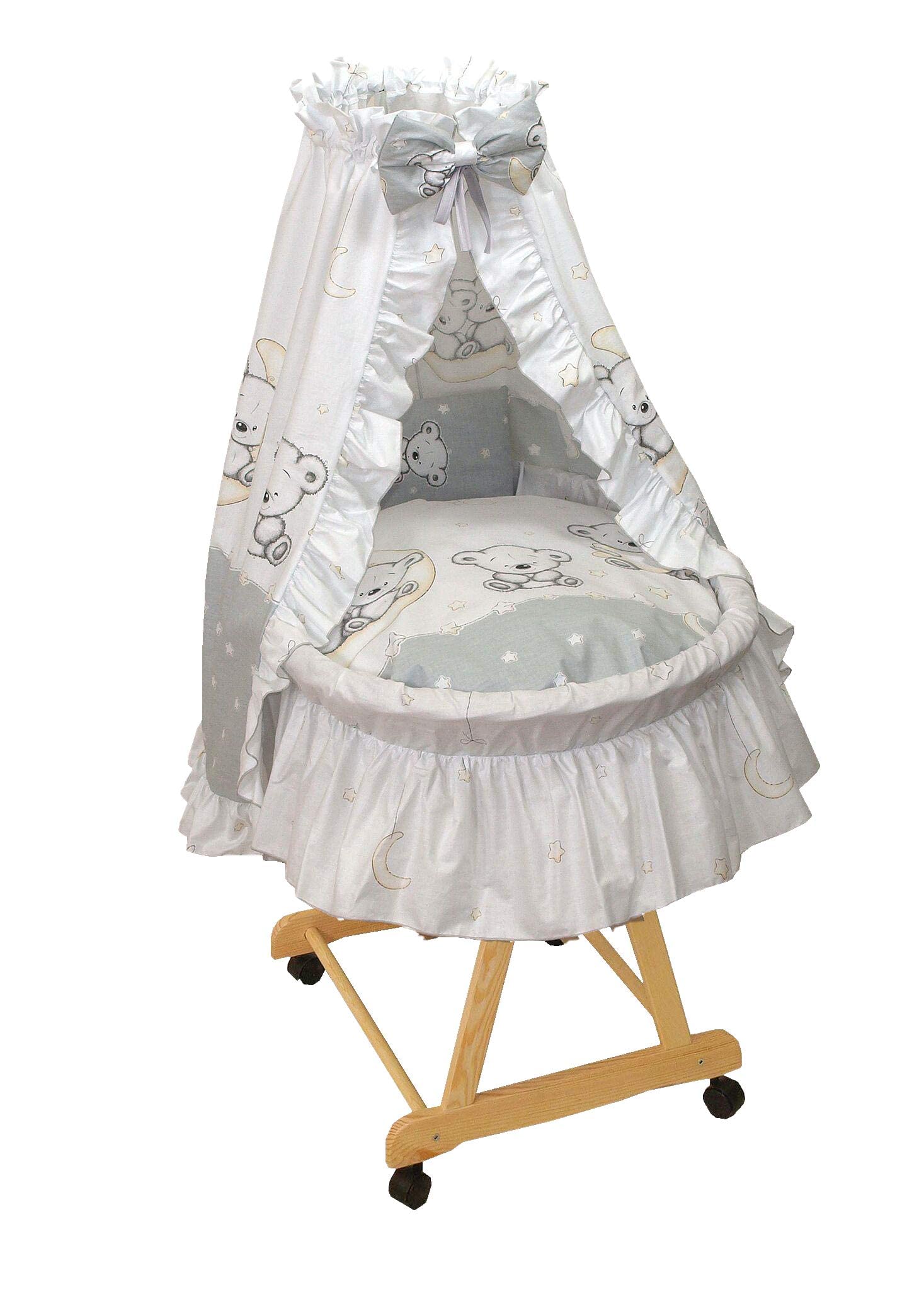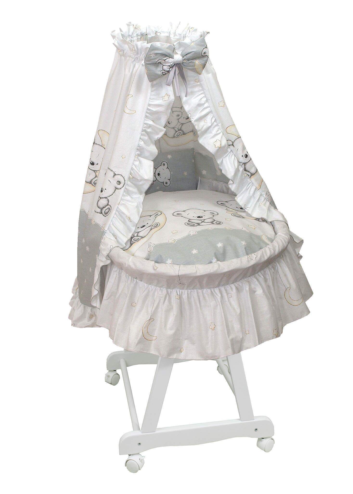 Der Amigos Stubenwagen weiß mit Bär Mond grau ist ein perfektes Zuhause für Ihr kleines Wunder! Der Stubenwagen wird mit viel Liebe zum Detail und handwerklichem Geschick gefertigt und ist somit ein echtes Unikat. Deshalb ist der Stubenwagen frei von Schadstoffen und für Allergiker geeignet. Zudem sorgt das atmungsaktive Material für eine optimale Luftzirkulation und ein angenehmes Schlafklima. Die Liegefläche von ca. 67 cm und die Breite von ca. 36 cm bieten ausreichend Platz für Ihr Baby. Der Stubenwagen wird komplett mit Ausstattung und Matratze geliefert, so dass Sie direkt loslegen können. Ein komplettes Babybett in einem entzückenden Design!
