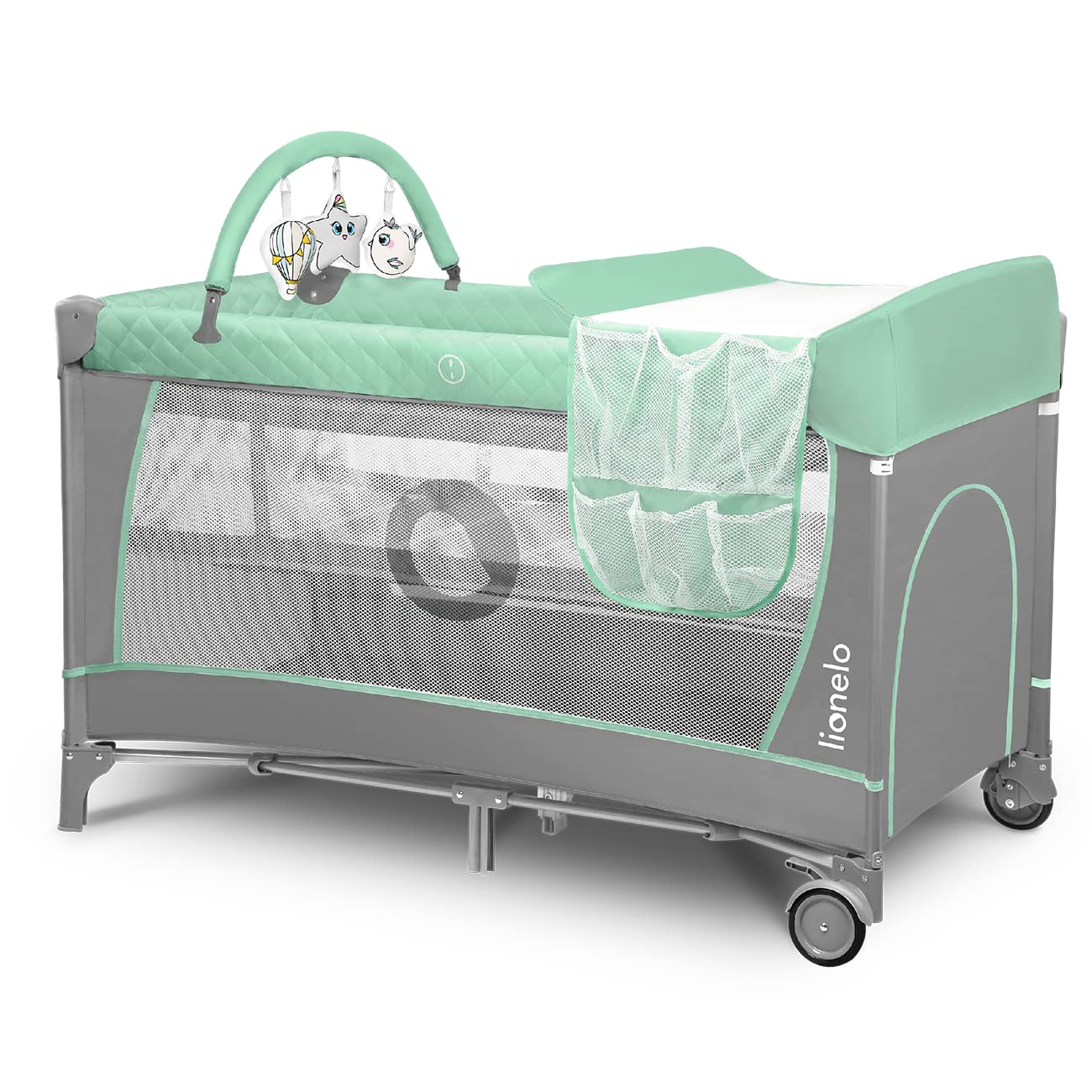 LIONELO Flower 4in1 Reisebett Baby, Laufstall Baby mit Seiteneingang, Wickeltisch, zwei Matratzenaufhängungshöhen, Spielzeugbogen mit Spielfiguren, Rollen, Tragetasche 1 Stück (1er Pack) Türkis