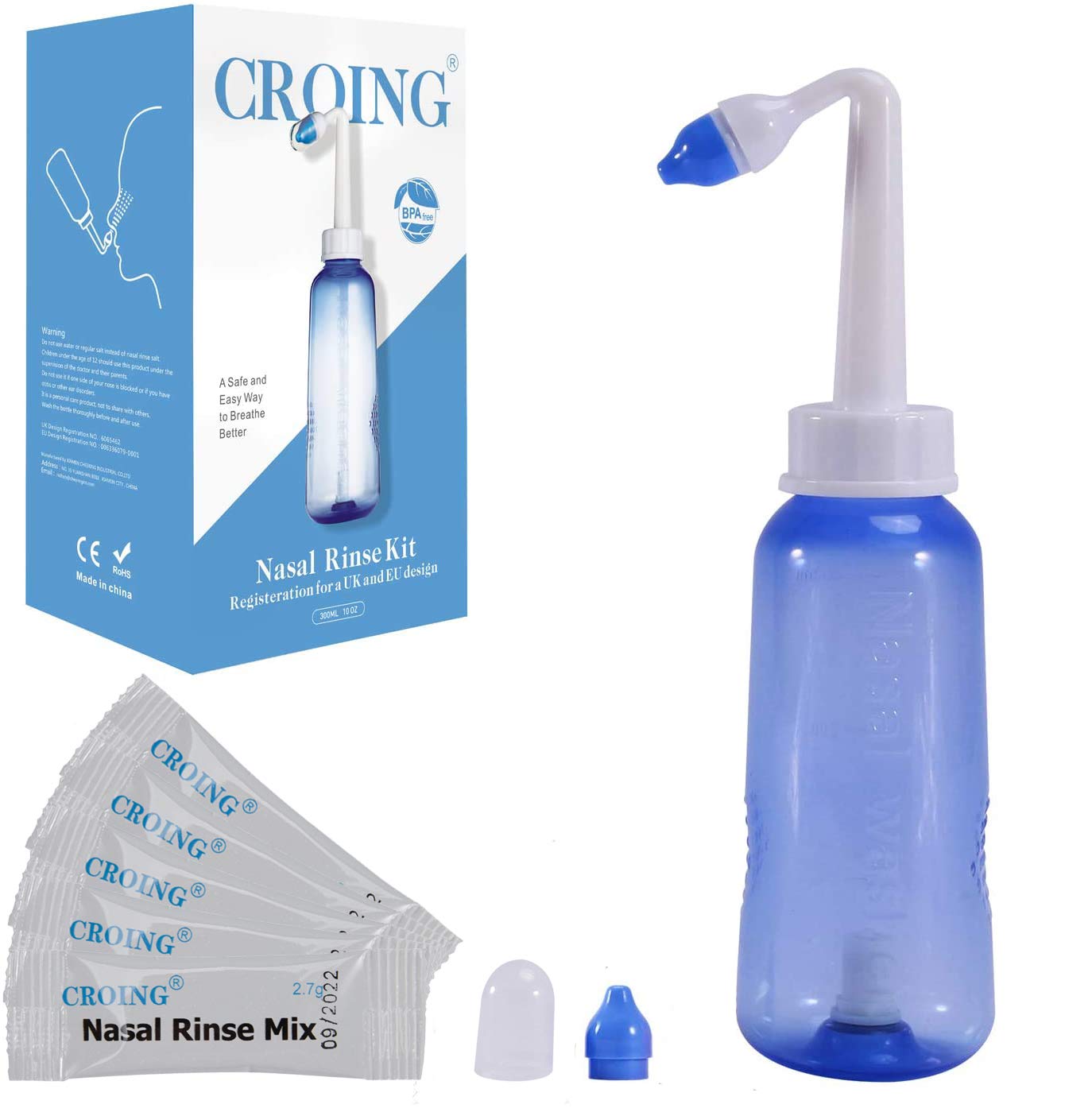 CROING - 40x Salz + 1x Nasendusche (300ml) - Neti pot, Nasendusche Nasenspülung Nasenreinigung Nase Spülen