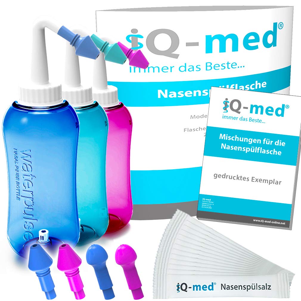 iQ-med Nasendusche 500ml + 44x Salz + Rezeptbuch + 4 Aufsätze (blau)