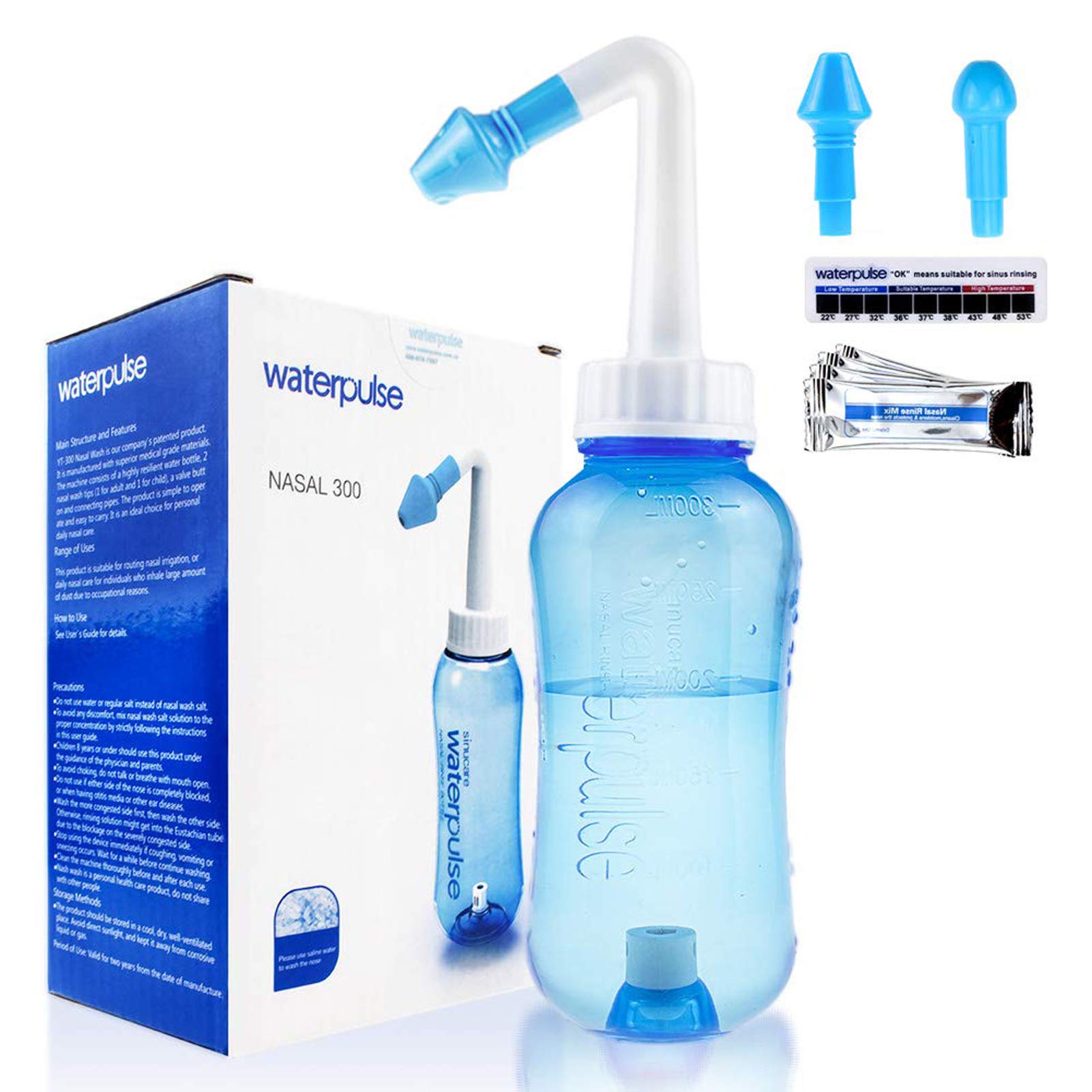 WATERPULSE Nasendusche mit Salz, 300ml Neti Pot Sinus Spülung mit 10 Nasenspülsalz Wash Salt Packets und Sticker Thermometer für Erwachsene & Kid BPA Free, Blue