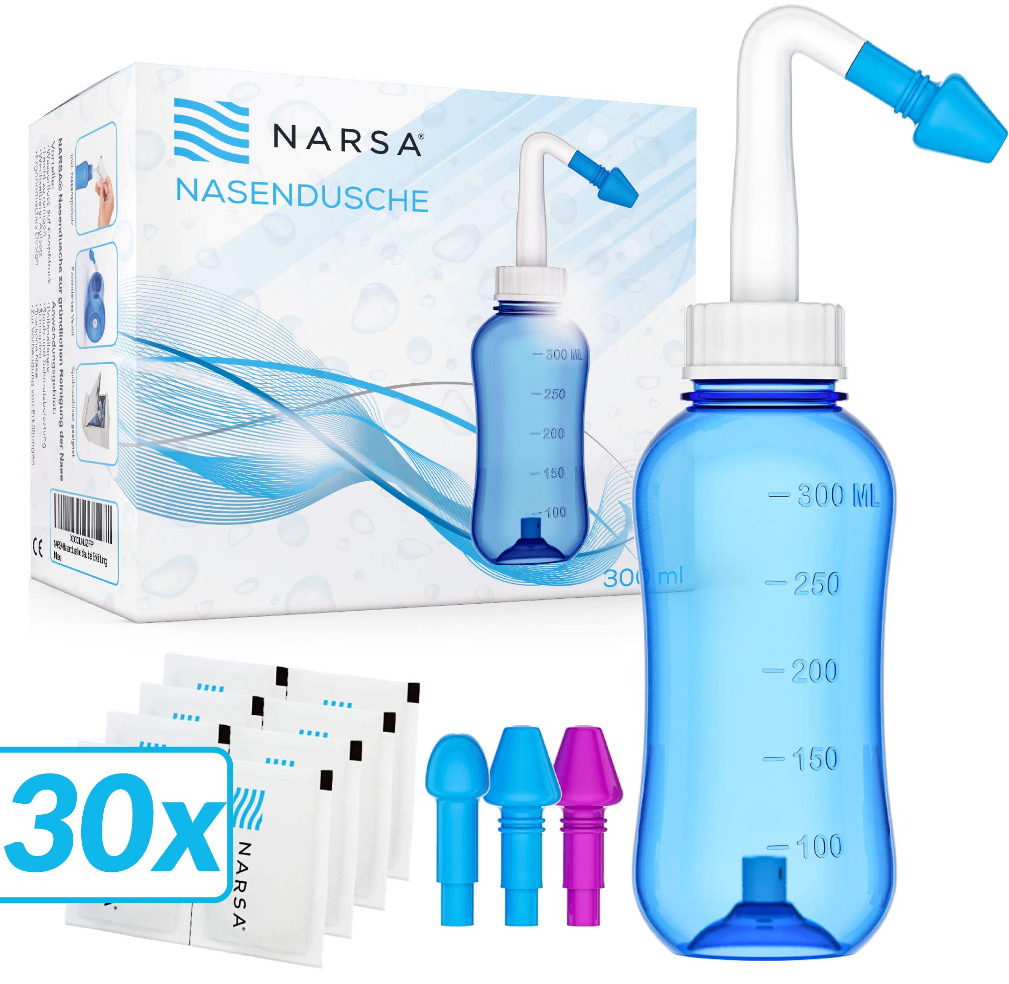 Nasendusche Set NARSA® · 30x Nasenspülsalz · 3 Aufsätze für Erwachsene und Kinder · Nasenspülkanne zur Nasenreinigung und Nasenspülung bei Erkältung und Allergie