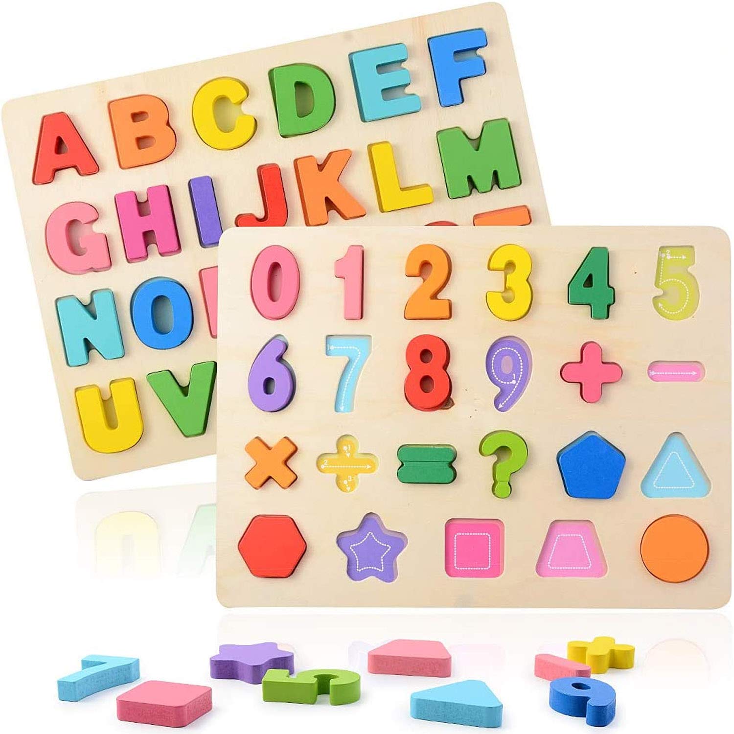 Voamuw Holzpuzzle für Kleinkinder, hölzerne Alphabet-Zahlen-Form-Puzzle für 3-4 5 Jahre alte Kinder, Montessori Spielzeug Lernspielzeug Lerngeschenk für Jungen Mädchen (Set von 3) Set2