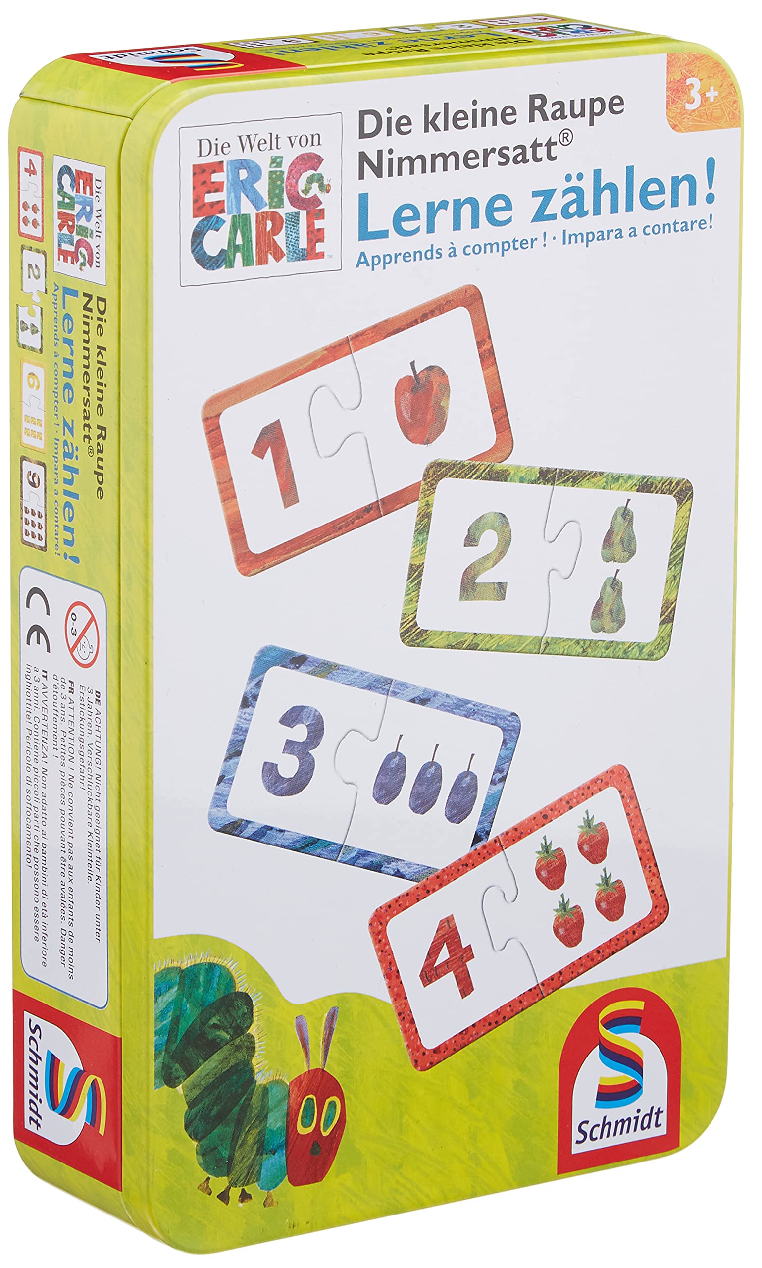 Schmidt Spiele 51238 Kleine Raupe Nimmersatt, Lerne zählen, Reisespiel in der Metalldose