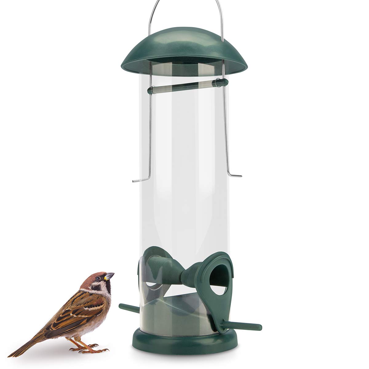 Mit diesem Metall Futterspender sorgen Sie nicht nur für ausreichend Nahrung für Ihre gefiederten Freunde, sondern auch für eine optische Aufwertung Ihres Gartens. Der Vogelfutterspender in Grün hat eine Pulverbeschichtung, die ein Verblassen der Farbe verhindert und somit ideal für das ganze Jahr geeignet ist. Mit einer Höhe von 35,6 cm und vier Futterstangen aus Metall, die wiederum 38 cm hoch sind, bietet der Futterspender ausreichend Platz für bis zu 700 g an Samen und Mischungen. Die sechs Futteröffnungen ermöglichen mehreren Vögeln gleichzeitig zu fressen, was besonders bei höherem Vogelaufkommen während der Fütterung von Vorteil ist. Das transparente Samenfach hilft Ihnen bei der Überwachung des Futtermittelstandes und gibt einen Hinweis, wann es wieder aufgefüllt werden sollte. Die robuste Konstruktion des Futterspenders stellt sicher, dass er allen Wetterbedingungen standhält und somit dauerhaft im Garten bleiben kann. Zudem punktet er mit einem traditionellen Design, welches mehr Federvögel in Ihren Garten locken wird. Der Aufhänger kann an Vogelfutterständern, Futterstationen, Futterhaken, Stangen oder Baumzweigen befestigt werden. Von gepunkteten Spechten bis hin zu Blaumeisen und Zottelfinken - der iBorn Vogelfutterspender ist für eine Vielzahl von Vögeln geeignet und verhilft Ihnen somit zu einem unvergesslichen Naturerlebnis im eigenen Garten! Bitte beachten Sie, dass das Samenfutter nicht im Lieferumfang enthalten ist.
