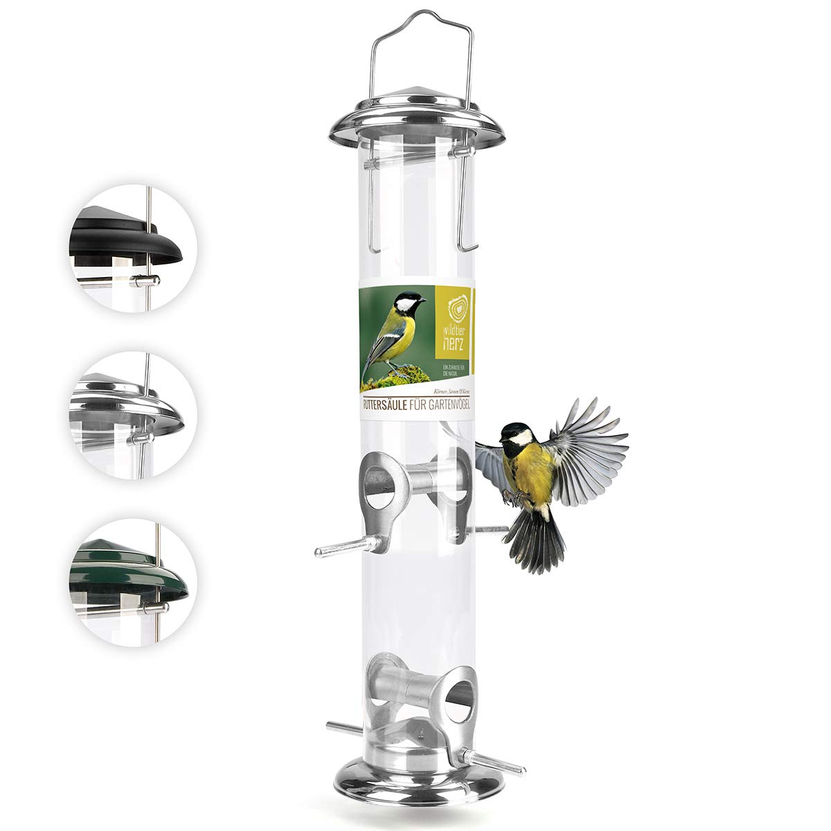 wildtier herz - Körner Vogelfutterspender 38cm - aus rostfreiem Edelstahl, Vogel Futterstation, Futtersäule, Wildvögel Futtersilo, ganzjährige Fütterung, Silber Silber 38cm