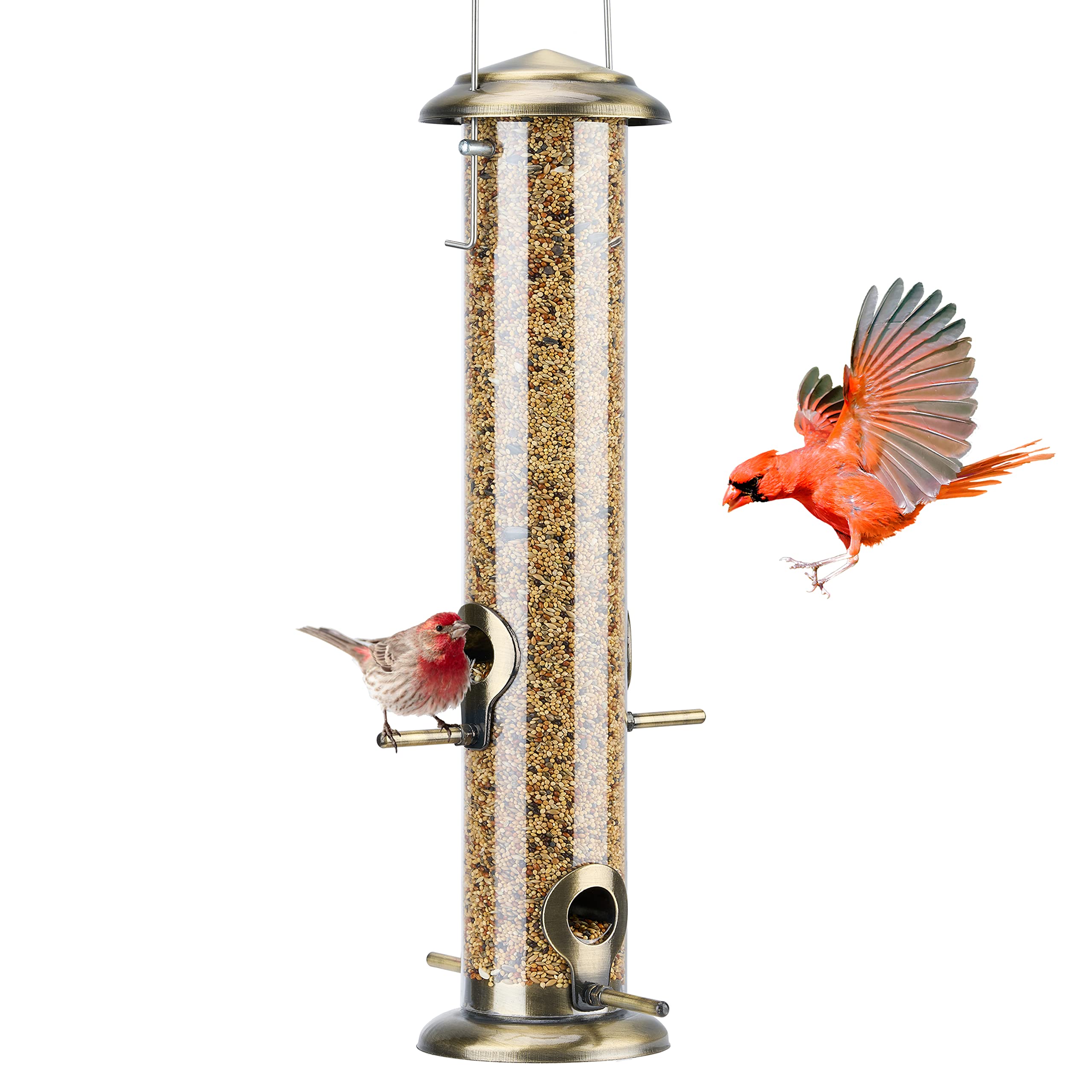 Kingsyard Metal Bird Feeders for Outside, Extra Thick Solid Transparent Tube Feeder with Steel Hanger, Hanging Bird Feeding Station for Year-Round Wild Birds, Brushed Bronze