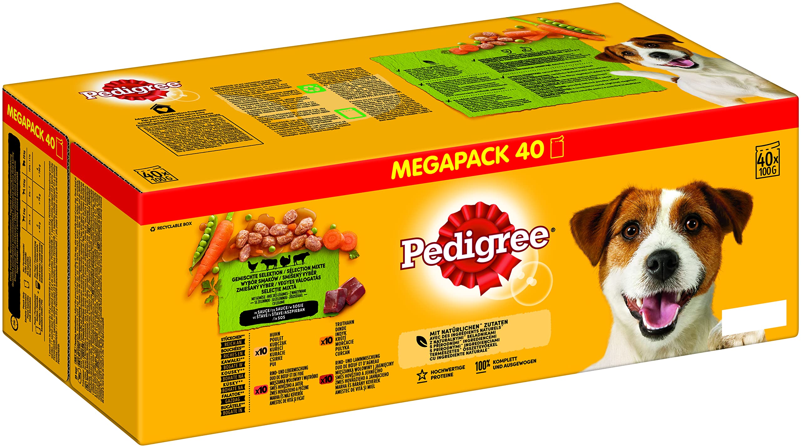 Pedigree Gemischte Selektion in Sauce - Hundenassfutter im Portionsbeutel - Hundefutter in Sauce mit Huhn - Rind - Truthahn & Lamm - Großpackung (40 x 100g) 4 Varietäten in Sauce 100g (40er Pack)